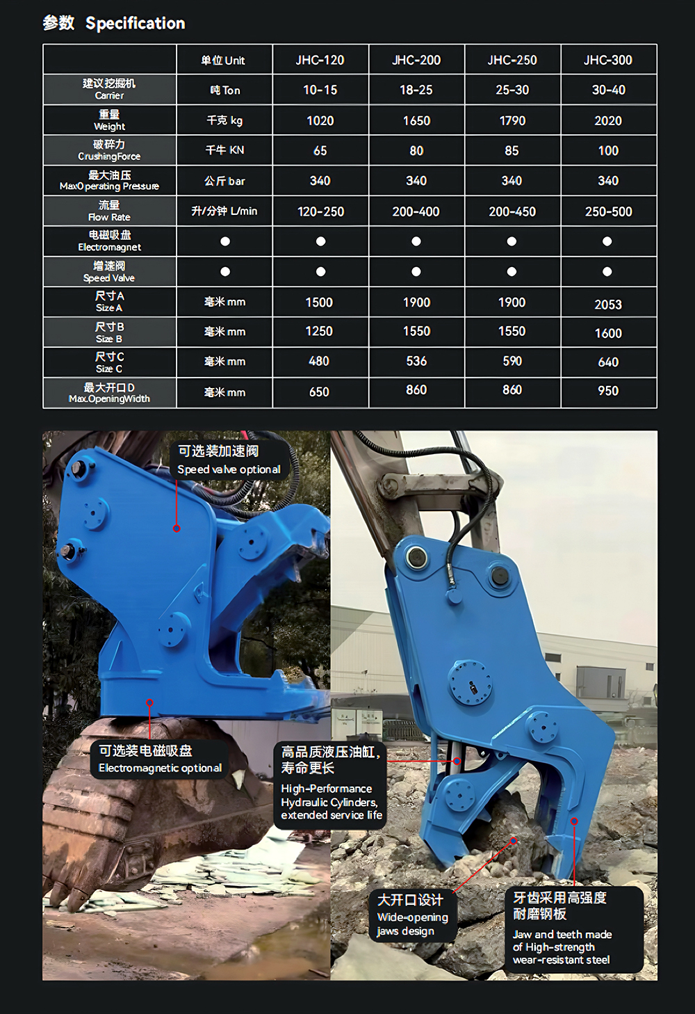 Mainly used for house demolishing, cement beams or supporting beams breaking. Hydraulic pulverizers paired with Hydraulic breakers significantly boost dlition efficiency for high-strength concrete beams/columns. Pulverizer as the ideal secondary demolition attachment, high-strength teeth pulverize all grades, extracting clean rebarr.